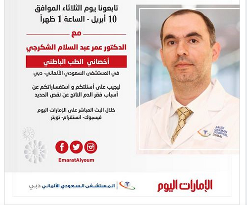 تابعونا، اليوم في تمام الساعة الواحدة ظهرا، ببث مباشر مع الدكتور عمر عبد السلام الشكرجي، أخصائي الطب الباطنى، في المستشفى السعودي الألماني - دبي ، للحديث والإجابة على اسئلتكم واستفساراتكم عن أسباب فقر الدم الناتج عن نقص الحديد .