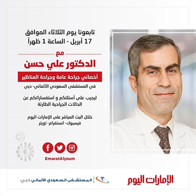 تابعونا، الآن في تمام الساعة الواحدة ظهرا، ببث مباشر مع الدكتور علي حسن، أخصائي جراحة عامة وجراحة المناظير، في المستشفى السعودي الألماني - دبي للحديث والإجابة على اسئلتكم واستفساراتكم عن الحالات الجراحية الطارئة.