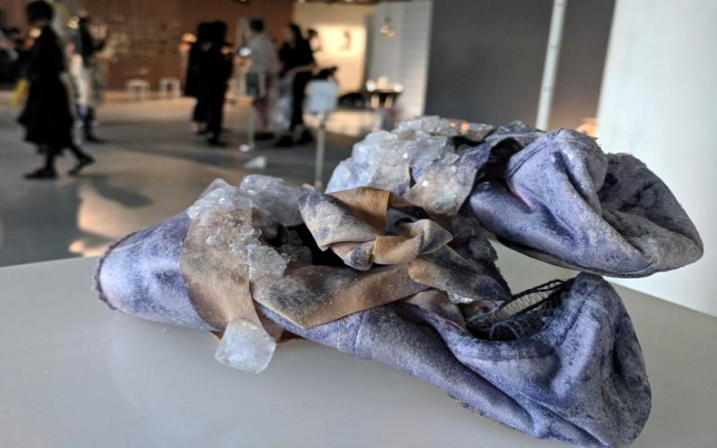 وفي عرض الأزياء السنوي للكلية الملكية للفنون قدمت بوتس نماذج لتصميماتها الغريبة ومنها حذاء باليه مزين ببلورات تشكلت من العرق وما بدا كأنه قطعة من الفراء مطعمة ببلورات من البول.