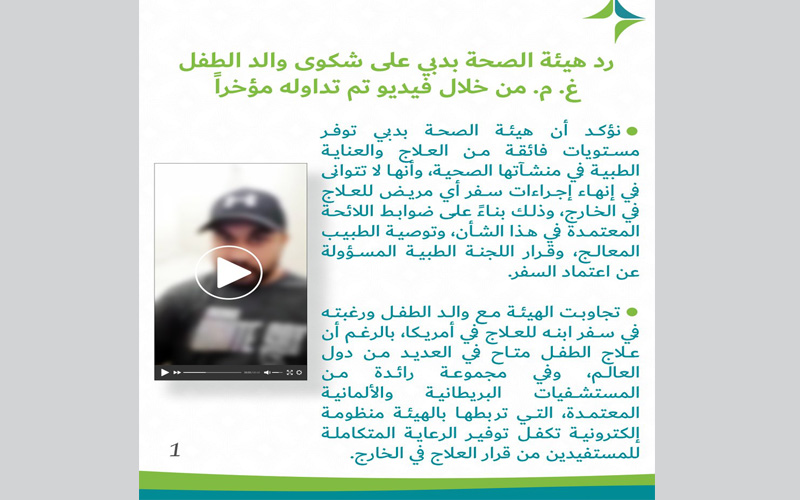 "صحة دبي" ترد على شكوى والد طفل حول تأخير اجراءات سفر علاج ابنه