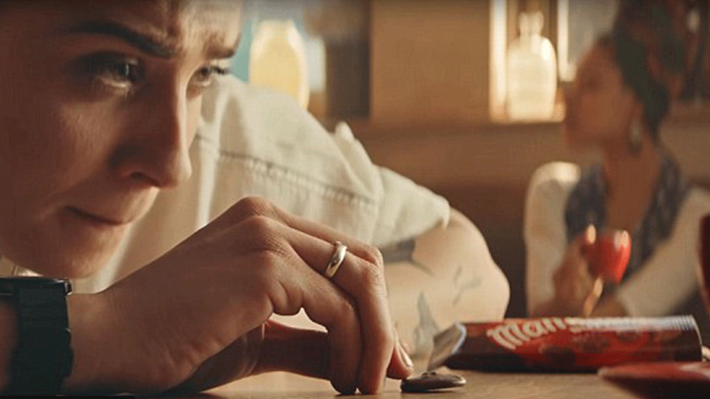 حيث يظهر الإعلان سيدتين تجلسان على طاولة وتقوم إحداهما بنقر زر شوكولاتة مالتيزرز إلى فم صديقتها.