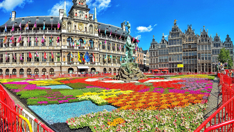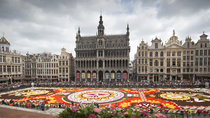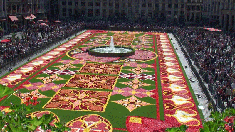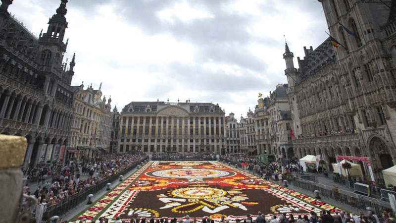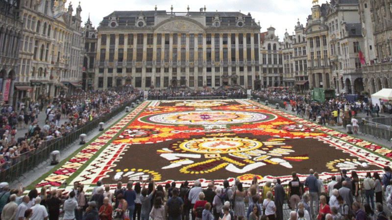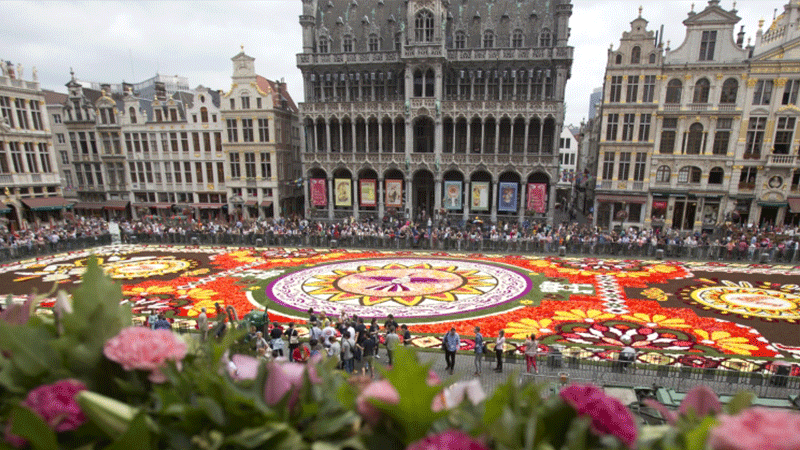 سجادة ساحرة من الزهور في الساحة الكبرى في العاصمة البلجيكية بروكسل استخدم في تكوينها نصف مليون زهرة طازجة من الزهور البلجيكية الشهيرة.