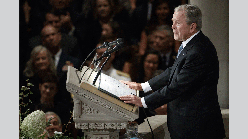 أظهرت لقطات تلفزيونية من مراسم جنازة جون ماكين أمس الرئيس الأميركي السابق جورج دبليو بوش يتجاذب أطراف الحديث مع ميشيل أوباما قرينة الرئيس الأميركي السابق باراك أوباما بينما يتابع المشيعون كلمة تأبين.