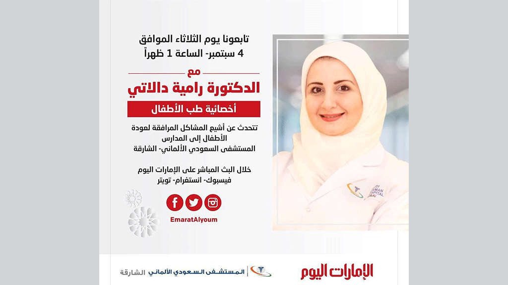 تابعونا اليوم، في تمام الواحدة ظهرا، ببث مباشر من المستشفى السعودي الألماني - الشارقة مع اختصاصية طب الأطفال الدكتورة رامية دالاتي، ، للحديث عن المشاكل الصحية المرافقة لعودة الأطفال إلى المدارس.
