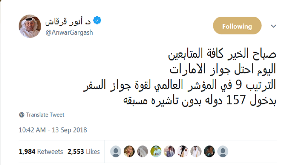 وكان وزير الدولة للشؤون الخارجية، الدكتور أنور بن محمد قرقاش غرد في حسابه الرسمي على "تويتر"، في وقت سابق من اليوم، "اليوم احتل جواز الامارات الترتيب 9 في المؤشر العالمي لقوة جواز السفر بدخول 157 دوله بدون تاشيره مسبقه".