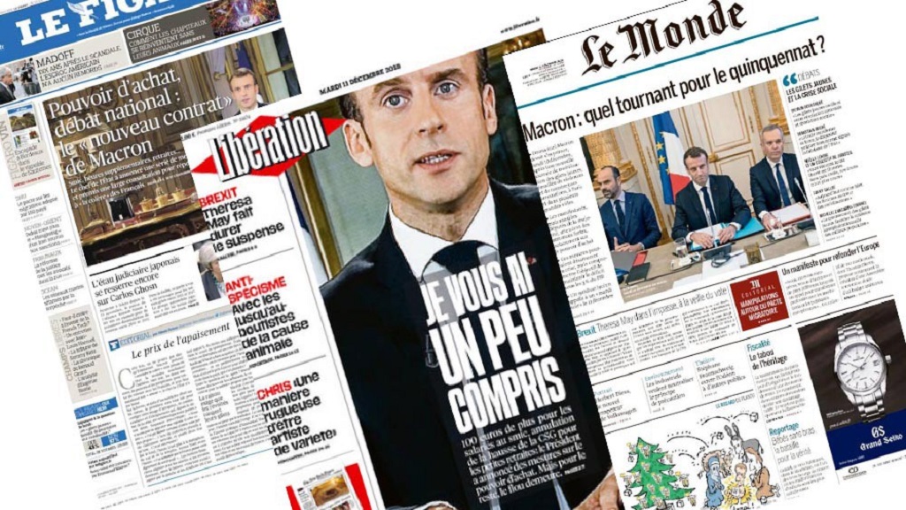 ولم تجد الصحافة الفرنسية أن أداء ماكرون كان مؤثرا. حيث أن معظم المحررين كتبوا أن دوره لم يكن فعالا، حيث أن غالبية الفرنسيين كانت تعلق الآمال على قدرة السلطة التنفيذية على إقناع "السترات الصفراء" بالتراجع عن هذه الحركة وايقاف الفوضى التي تثيرها في البلاد. معبرين، من وجهة نظرهم، أن رئيس الدولة لم يقم سوى بتقديم التنازلات.