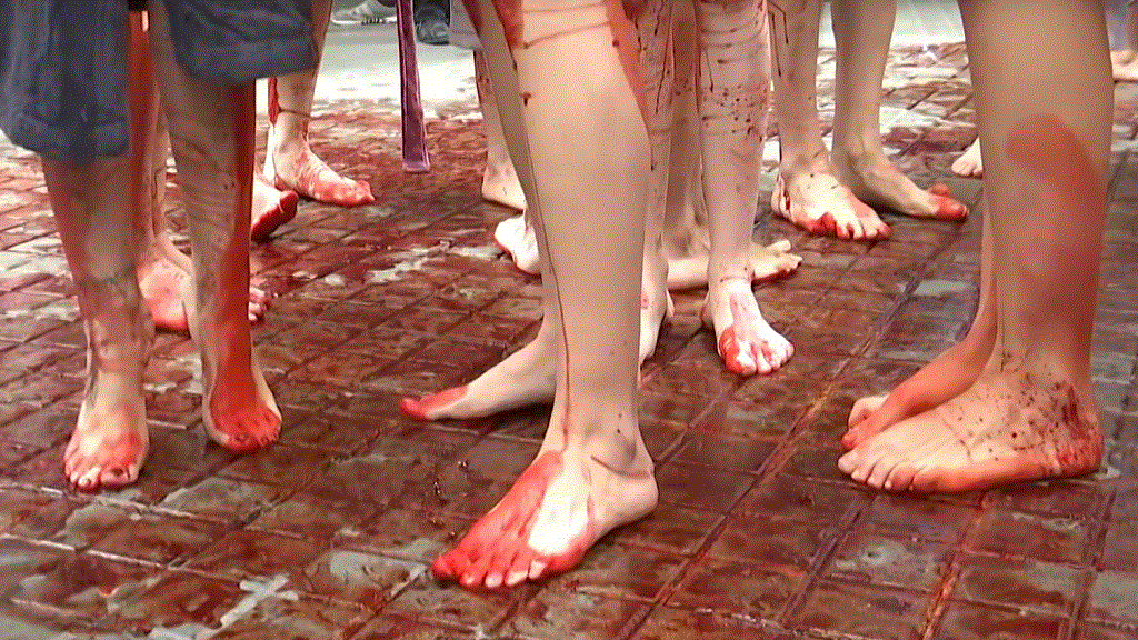 المتظاهرون سكبوا على أجسادهم العارية سائلاً أحمر يرمز للدم. (من المصدر)