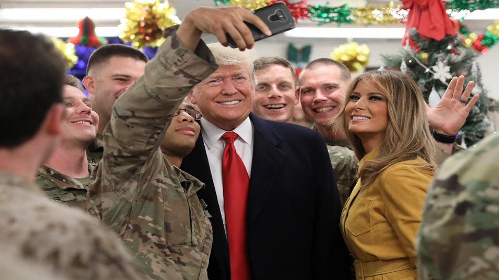 قام الرئيس الأميركي دونالد ترامب بزيارة مفاجئة للقوات الأميركية في العراق، أمس، بمناسبة عيد الميلاد وهي أول زيارة له لمنطقة صراعات بعد عامين تقريبا من رئاسته وعقب أيام من الإعلان عن سحب القوات الأمريكية من سورية.