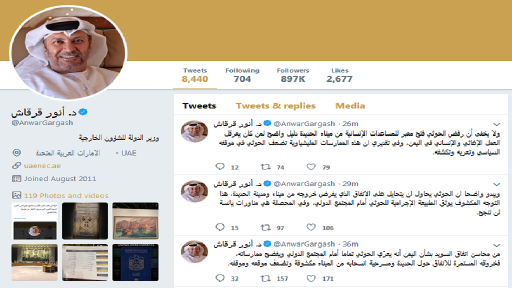 وختم قرقاش: "لا يخفى أن رفض الحوثي فتح معبر للمساعدات الإنسانية من ميناء الحديدة دليل واضح لمن كان يعرقل العمل الإغاثي والإنساني في اليمن، وفي تقديري ان هذه الممارسات المليشياوية تضعف الحوثي في موقفه السياسي وتعريه وتكشفه".