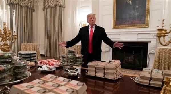 استقبل الرئيس الأميركي دونالد ترامب أعضاء من فريق كليمسون تايغرز لكرة القدم الأميركية، المتوج مؤخراً بلقب البطولة الوطنية للجامعات، بطريقة غريبة، حيث فوجئ الضيوف بكمية هائلة من ساندويتش همبرغر من برجر كينغ وماكدونالدز ووينديز للوجبات السريعة.