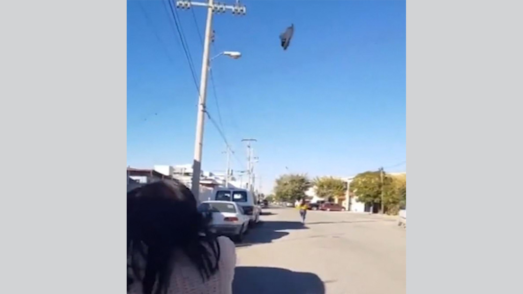 ويظهر في الفيديو، الذي نشره موقع صحيفة "الديلي ميل" البريطانية، "شبشب" الأم يطير بسرعة وبشكل مباشر كالسهم تجاه الابنة قبل أن يصيبها بين كتفيها ويطرحها أرضا.
