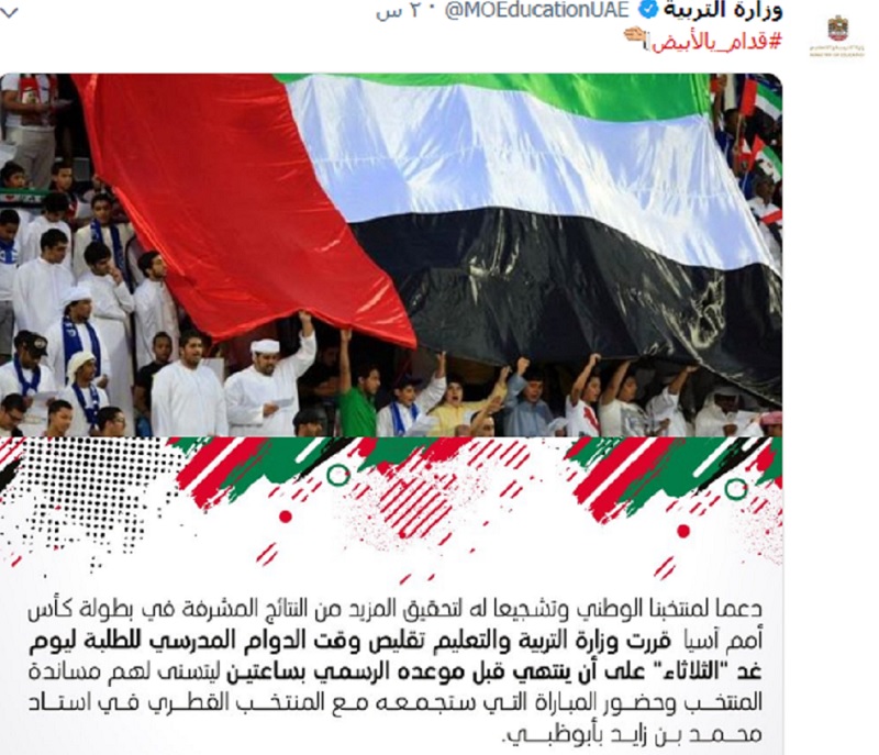 وقالت الوزارة في تغريدة لها عبر موقع التواصل الإجتماعي "تويتر"، "دعماً لمنتخبنا الوطني وتشجيعاً له لتحقيق المزيد من النتائج المشرفة في بطولة كأس أمم آسيا قررت وزارة التربية والتعليم تقرر تقليص وقت الدوام للطلبة ساعتين يوم غد الثلاثاء ليتسنى لهم مساندة المنتخب الوطني في مباراته أمام المنتخب القطري في استاد محمد بن زايد بأبوظبي.