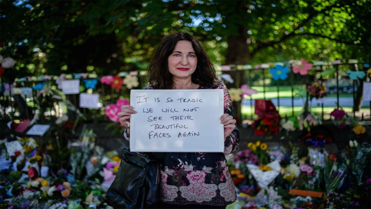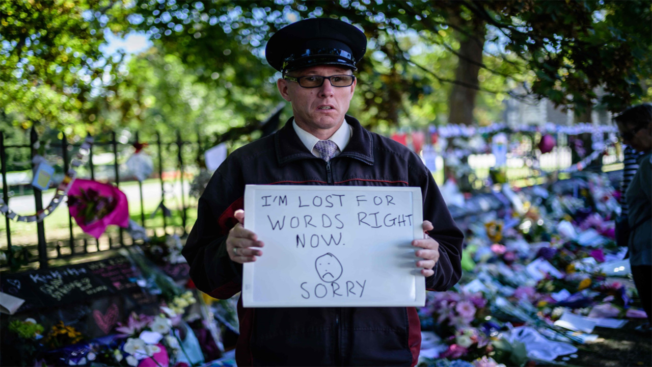 وكان من أبرز العبارات التي رُفعت على ألواح بيضاء بجانب الزهور في مدينة كرايست تشيرتش: "لا وقت للكراهية"، و"قلوبنا معكم"، و"سنواصل الصلاة وسنبقى متحدين"، و"هذا مؤلم جدا.. لن نتمكن من رؤية تلك الوجوه الرائعة مجددا"، و"الحب هو المفتاح"، كما رفع أحد رجال شرطة المدينة عبارة "لا أملك الكلام الآن.. اعتذر".