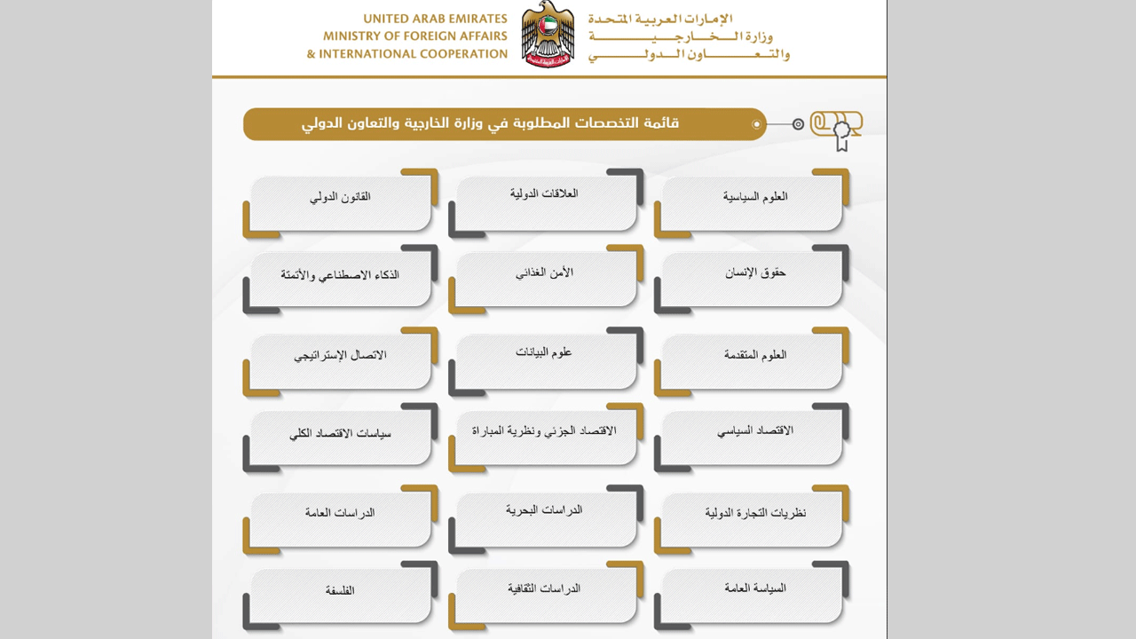 أعلنت وزارة الخارجية والتعاون الدولي عن فتح باب التسجيل، وبدء استقبال طلبات الراغبين بالانضمام للسلك الدبلوماسي للدولة.. وفي الصور نوضح الشروط، والتخصصات المطلوبة للراغبين بالتقدم بطلباتهم من أبناء الدولة.