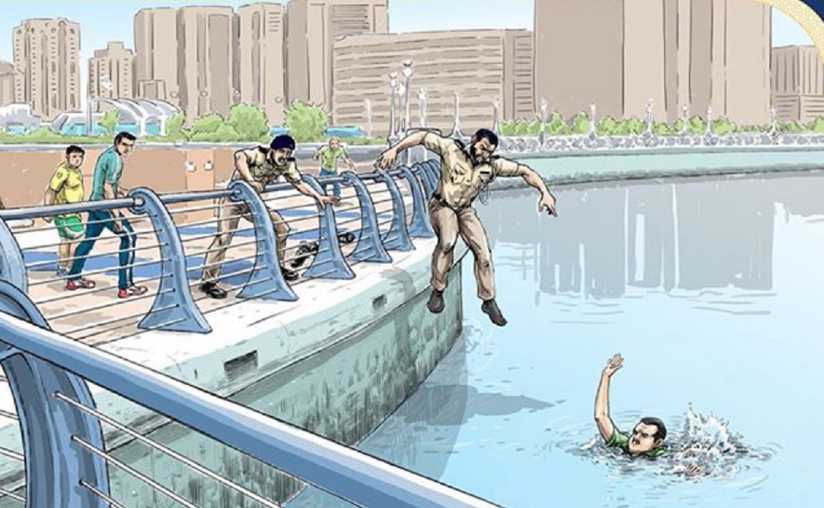 أنقذ أحد أفراد شرطة أبوظبي شرطة أبوظبي سائق مركبة آسيوياً من الغرق لإصابته بصدمة نفسية نتيجة حادث تصادم بين مركبتين، أدت لرمي نفسه في البحر، وهو في حالة عدم إدراك ووعي كامل لما يقوم به من تصرف خطر قديؤدي الى غرقه في البحر.
