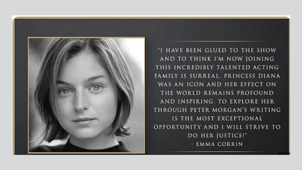 وأعربت الممثلة الحسناء إيما كورين عن فرحتها من خلال تغريدة على تويتر لاختيارها لتأدية هذا الدور وقالت " اضممت لعائلة The Crown لأجسد موهبة لا تصدق، دور الأميرة ديانا فرصة استثنائية وسأبذل قصارى جهدي لإنصافها".