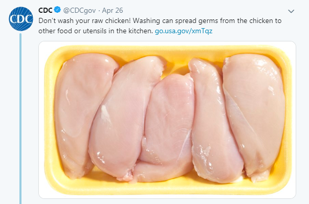 وجاء التحذير من غسل الدجاج قبل طهية في تغريدة نشرها الحساب الرسمي لمركز السيطرة على الأمراض والوقاية في أميركا "سي دي سي" تقول:
