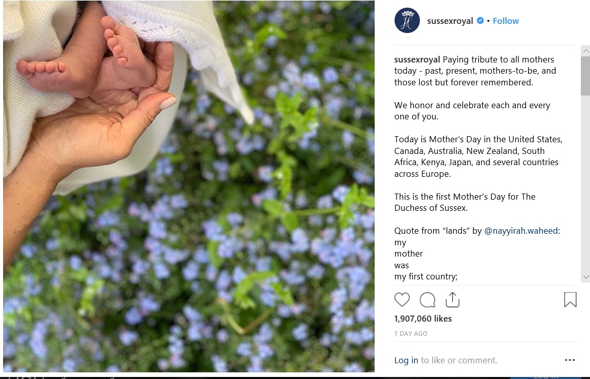 نشرت ميغان ماركل صورة على موقع إنستغرام تظهر فيها يديها وهما تداعبان قدمي ابنها، آرتشي هاريسون ماونتباتن- وندسور، وفي الخلفية زهور الربيع.