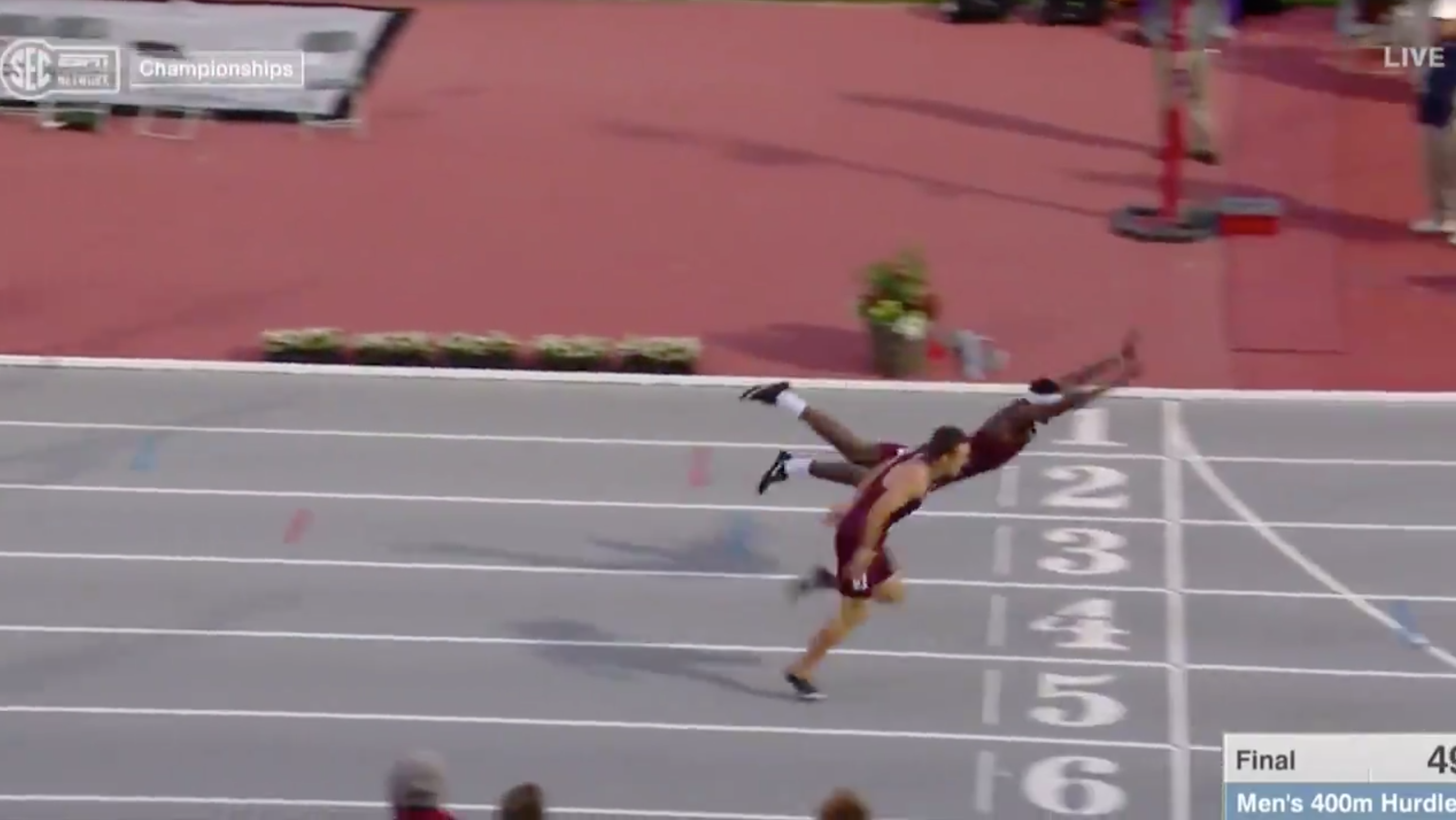 شاهد.. بقفزة “سوبر مان”.. عداء أميركي يفوز بسباق حواجز
