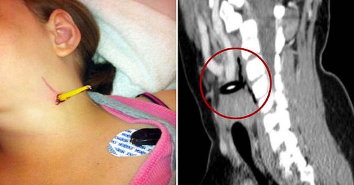 وأظهرت الأشعة المقطعية أن قلم الرصاص يسد الشريان السباتي الأيسر تماما، في عنق الطالبة، ولكن النبض كان ضمن المعدل الطبيعي ولم تكن تعاني من مشاكل في التنفس.