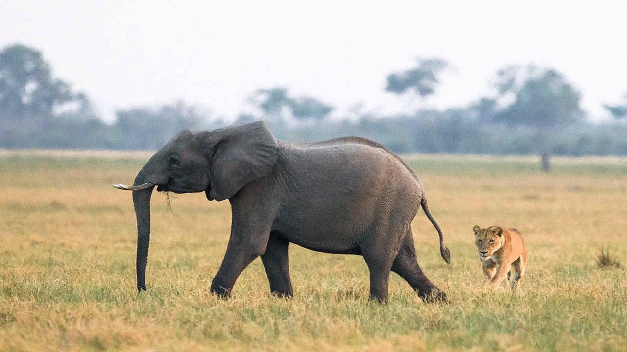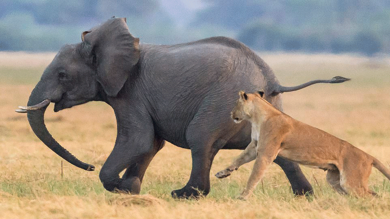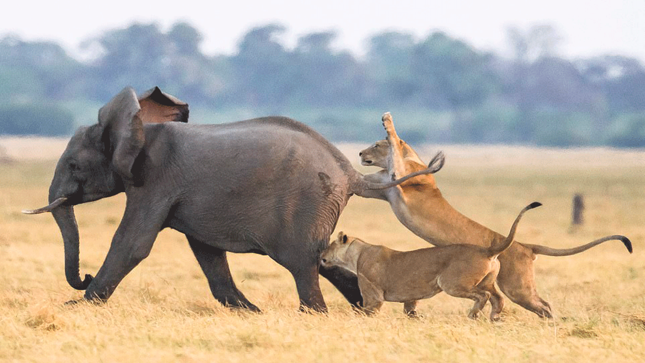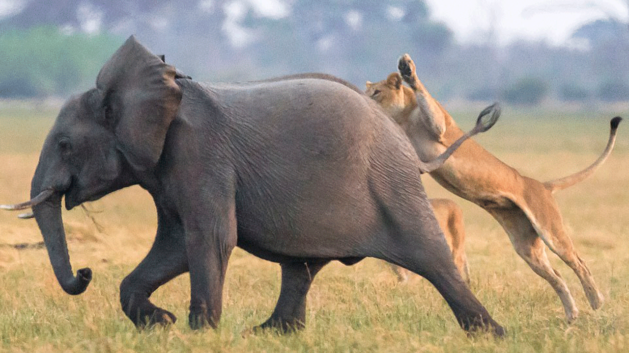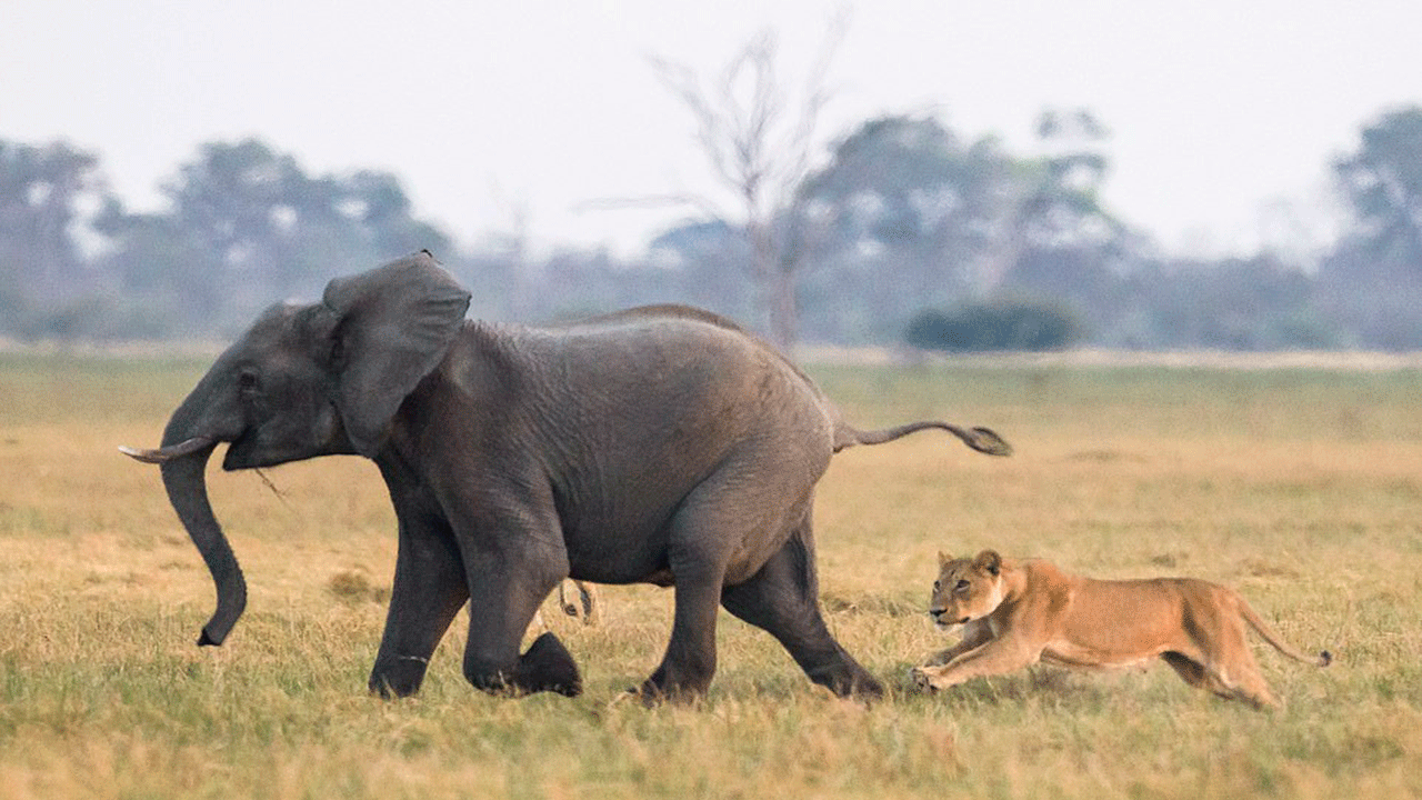 نجح قطيع من الفيلة في تخليص فيل من مطاردة كادت أن تنتهي بموته، حيث تمكنت لبوة منه واستطاعت اعتلاء ظهره قبل أن يتجمع الفيلة على مسافة 20 متر الأمر الذي أثار الخوف لديها، في سباق تفوق فيه الحجم على قوة وسرعة اللبوة.