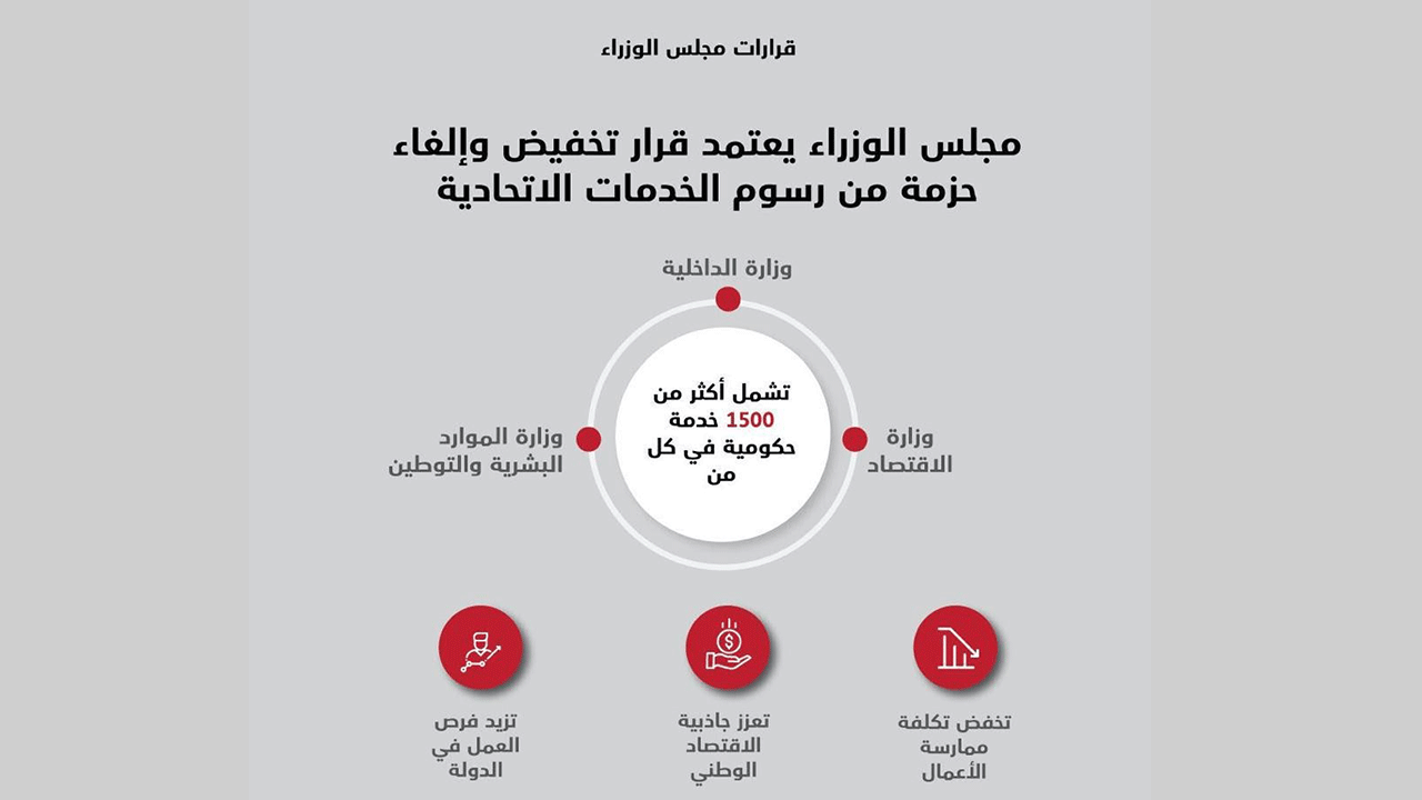 ويأتي القرار تسهيلا على المواطنين والمقيمين، وتعزيزاً للنمو الاقتصادي في الدولة، حيث تضمن تعديل أو إلغاء رسوم أكثر من 1500 خدمة حكومية في كل من وزارة الداخلية ووزارة الاقتصاد ووزارة الموارد البشرية والتوطين.
