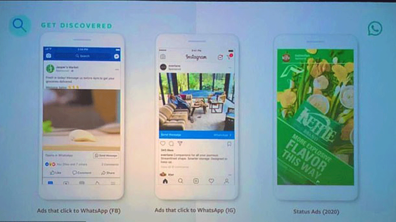 أكدت الشركة الأم لواتساب "فيس بوك"، أن الإعلانات ستبدأ بالظهور للمستخدمين العام المقبل 2020 بحسب ما جاء في موقع "ديلي ميل" البريطاني.