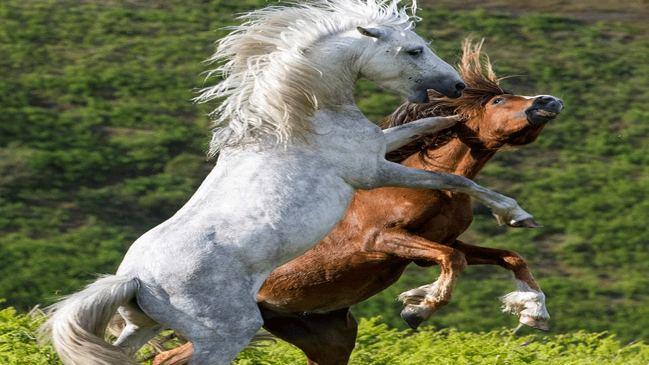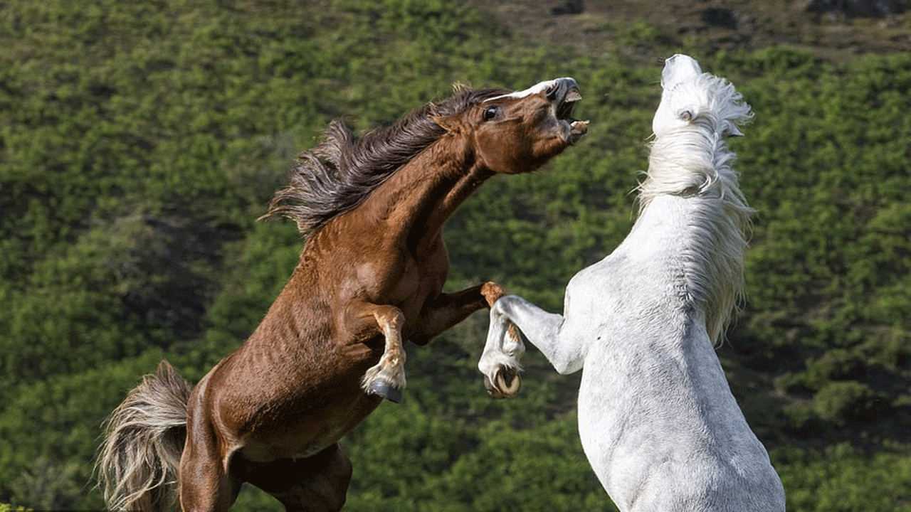 وبحسب المصور حاول الحصان البني الاقتراب من أنثى في القطيع، إلا أن الحصان الأبيض تصدى لمحاولاته في معركة وصفت بالنادرة والمثيرة.