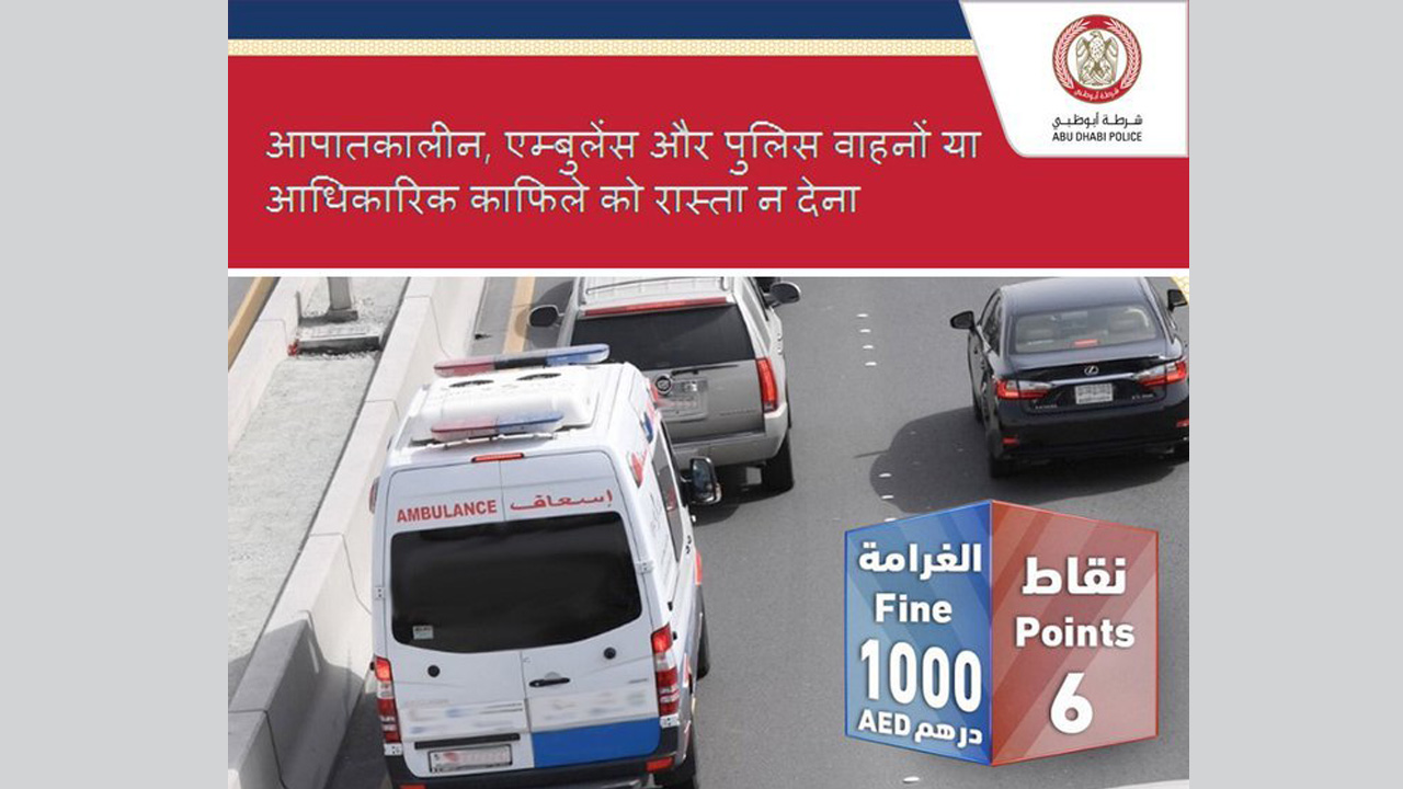 بخمس لغات.. شرطة أبوظبي تحث السائقين على إعطاء أفضلية الطريق لمركبات الطوارئ والشرطة