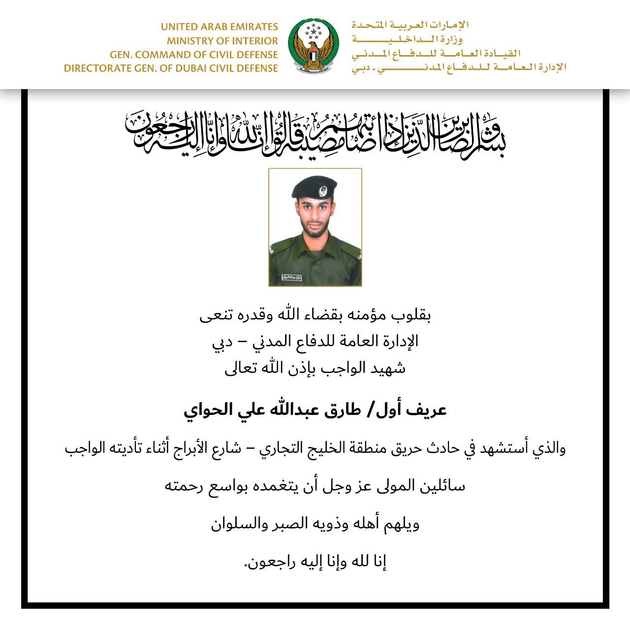 نعى الدفاع المدني بدبي اليوم في حسابه الرسمي على تويتر شهيد الواجب العريف طارق عبدالله علي الحواي، والذي استشهد في حادث حريق منطقة الخليج التجاري - شارع الأبراج ، أثناء تأدية الواجب.