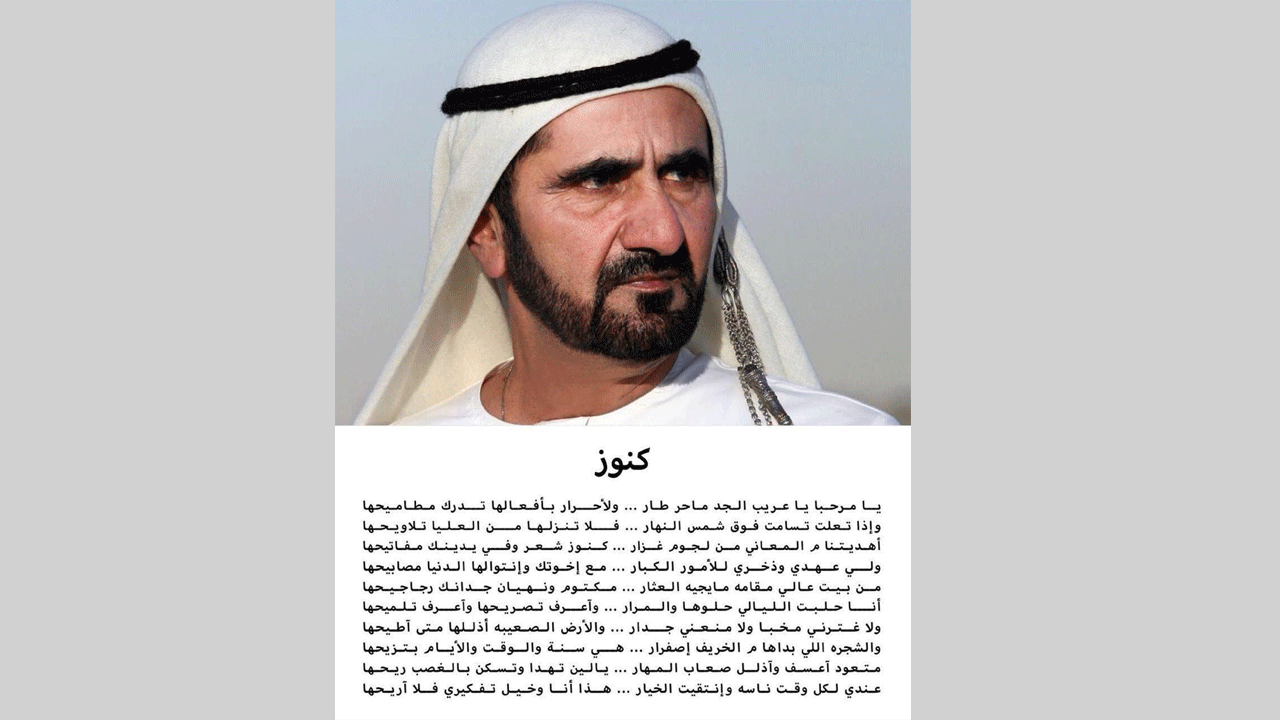 نشر صاحب السمو الشيخ محمد بن راشد آل مكتوم، نائب رئيس الدولة، رئيس مجلس الوزراء حاكم دبي، قصيدة جديدة من أشعاره تحمل عنوان "كنوز":
