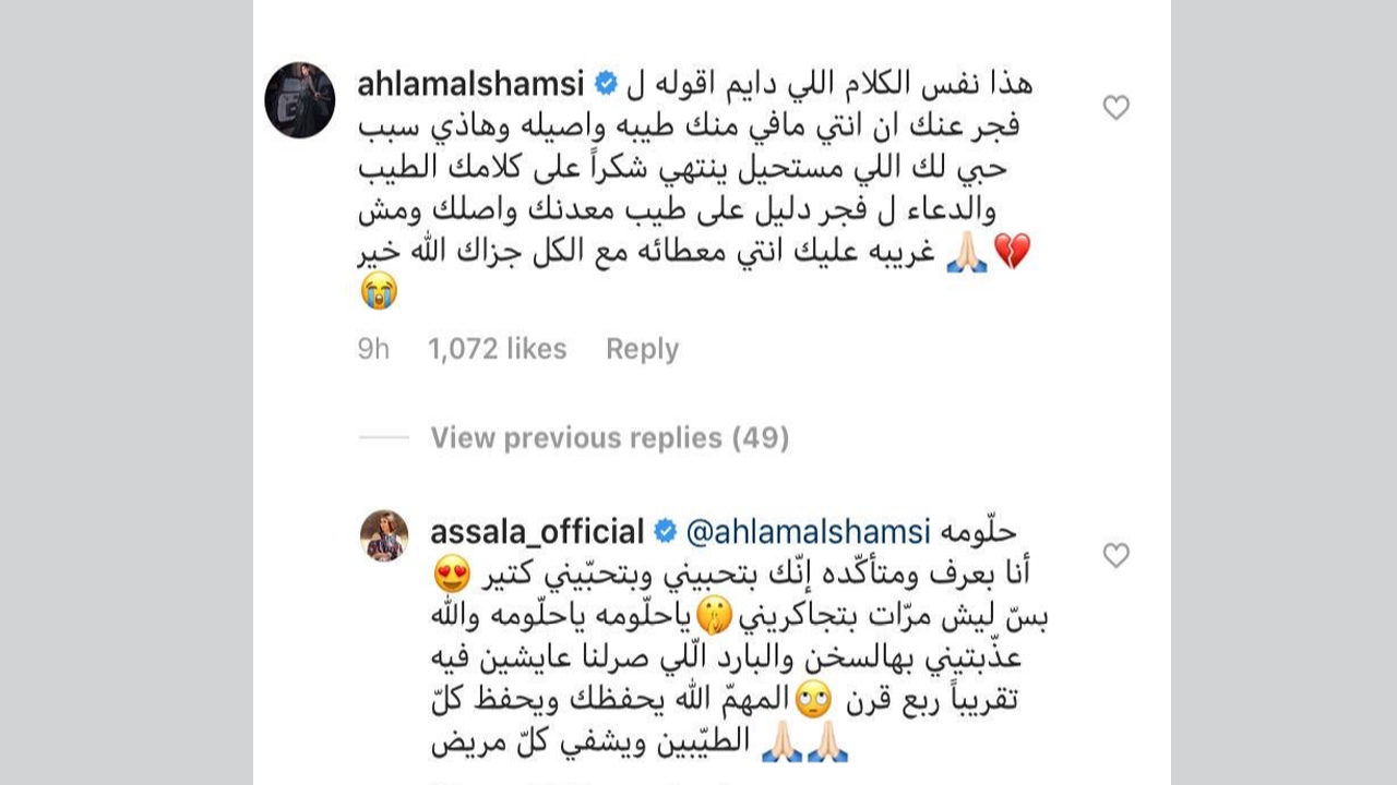 فيما يبدو أن الفنانة أصالة لا ترغب بفتح باب لا للنقاش أو حتى الجدل مع أحلام فردت على تعليق الأخيرة وكتبت: "حلومة أنا بعرف ومتأكدة إنك بتحبيني وبتحبيني كتير... بس ليش مرات بتجاكريني يا حلومة يا حلومة والله عذبتيني بهالسخن والبارد اللي صارلنا عايشين فيه تقريبا ربع قرن... المهم الله يحفظك ويحفظ كل الطيبين ويشفي كل مريض".
