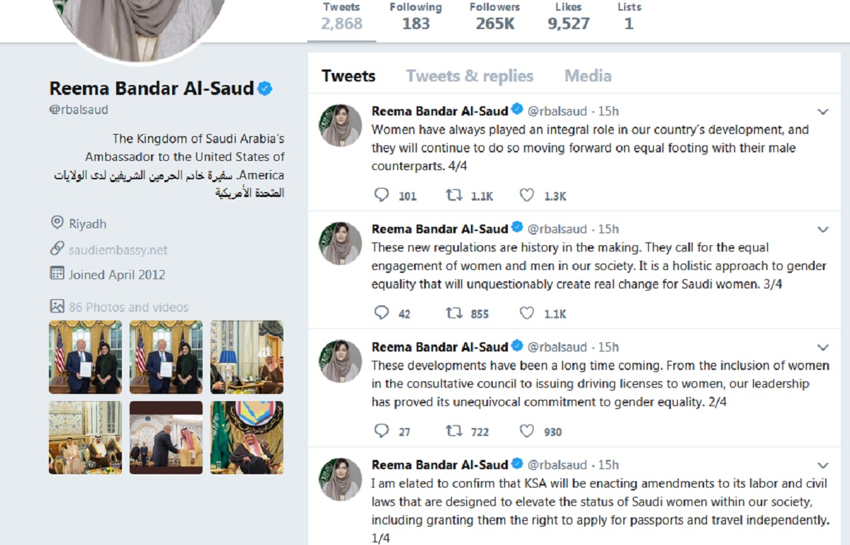 أكدت الأميرة ريما بندر آل سعود سفيرة المملكة العربية السعودية لدى الولايات المتحدة، أن المملكة العربية السعودية، أقرت تعديلات على اللوائح التي ستمنح حق المرأة السعودية البالغة في الحصول على جواز سفر وسفر دون موافقة الأوصياء، حيث نشرت سلسلة تغريدات عبر حسابها بموقع التواصل الإجتماعي "تويتر" بهذا الشأن قائلة في التغريدة الأولى "يسعدني أن أؤكد أن المملكة العربية السعودية ستسن تعديلات على قوانين العمل والمدنية الخاصة بها والتي تهدف إلى رفع مكانة المرأة السعودية داخل مجتمعنا، بما في ذلك منحها الحق في التقدم بطلب للحصول على جوازات سفر والسفر بشكل مستقل".