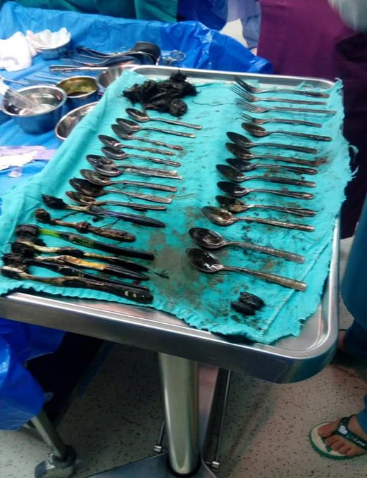 وبالفحص الطبي باستخدام المنظار والإشعات تبين وجود أجسام غريبة بحسب صحيفة اليوم السابع المصرية، وأجريت عملية استكشاف جراحي، وتم استخراج عدد من الملاعق والشوك، وخاتم ذهب وسلاسل وبعض الأجسام الغريبة، وخرج المريض من العمليات وحالته مستقرة حالياً.