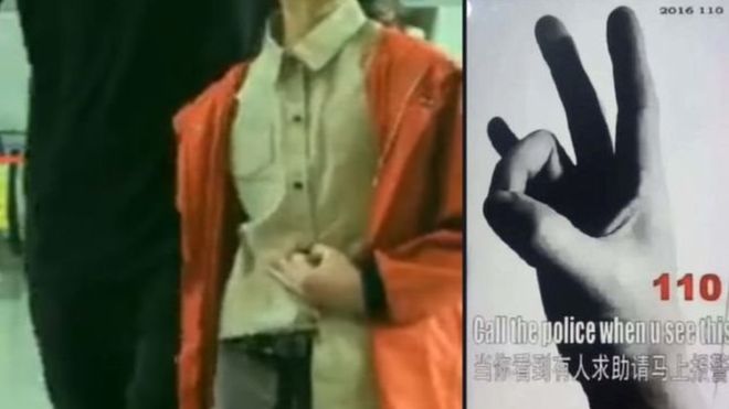 ولكن تحويل يدك بحيث تواجه كفك تمثل رسالة ذات مغزى في الصين؛ فلو تم ضغط إصبعين مع بعضهما ستبدو يدك أشبه برقم 110، وهو رقم هاتف الطوارئ للشرطة الصينية، ومن هنا فقد تَنَبّه أحد الركاب إلى أن الفتاة تطلب المساعدة.