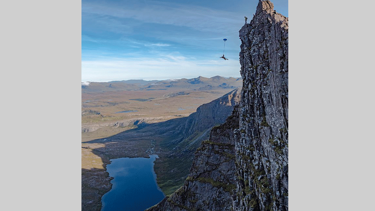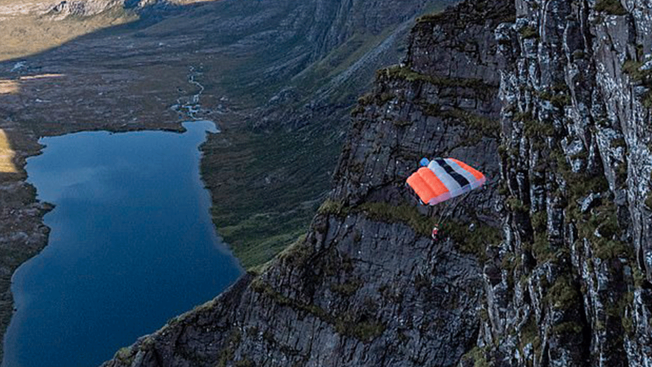 وكانت مظلته تسير بسرعة 30 ميلا بالساعة، في محاولة لتحقيق لقب صاحب أول قفزة من مرتفعات لورد بيركيلي في اسكتلندا.