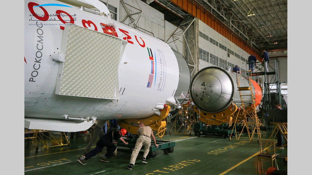 تزين صاروخ سويوز أف جي بعلم الإمارات وشعار مركز محمد بن راشد للفضاء إلى جانب علمي روسيا وأميركا استعدادا للمهمة التاريخية في 25 سبتمبر الحالي .