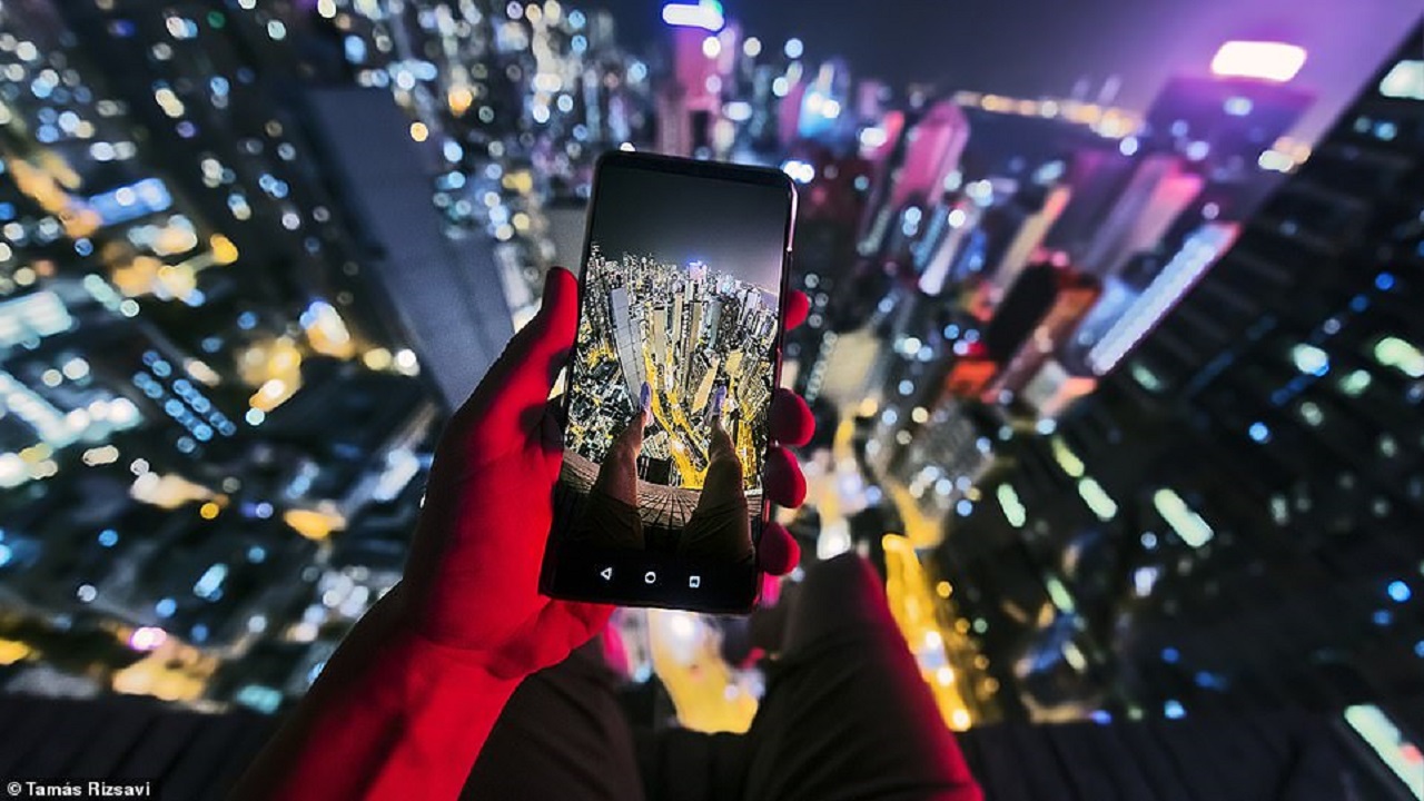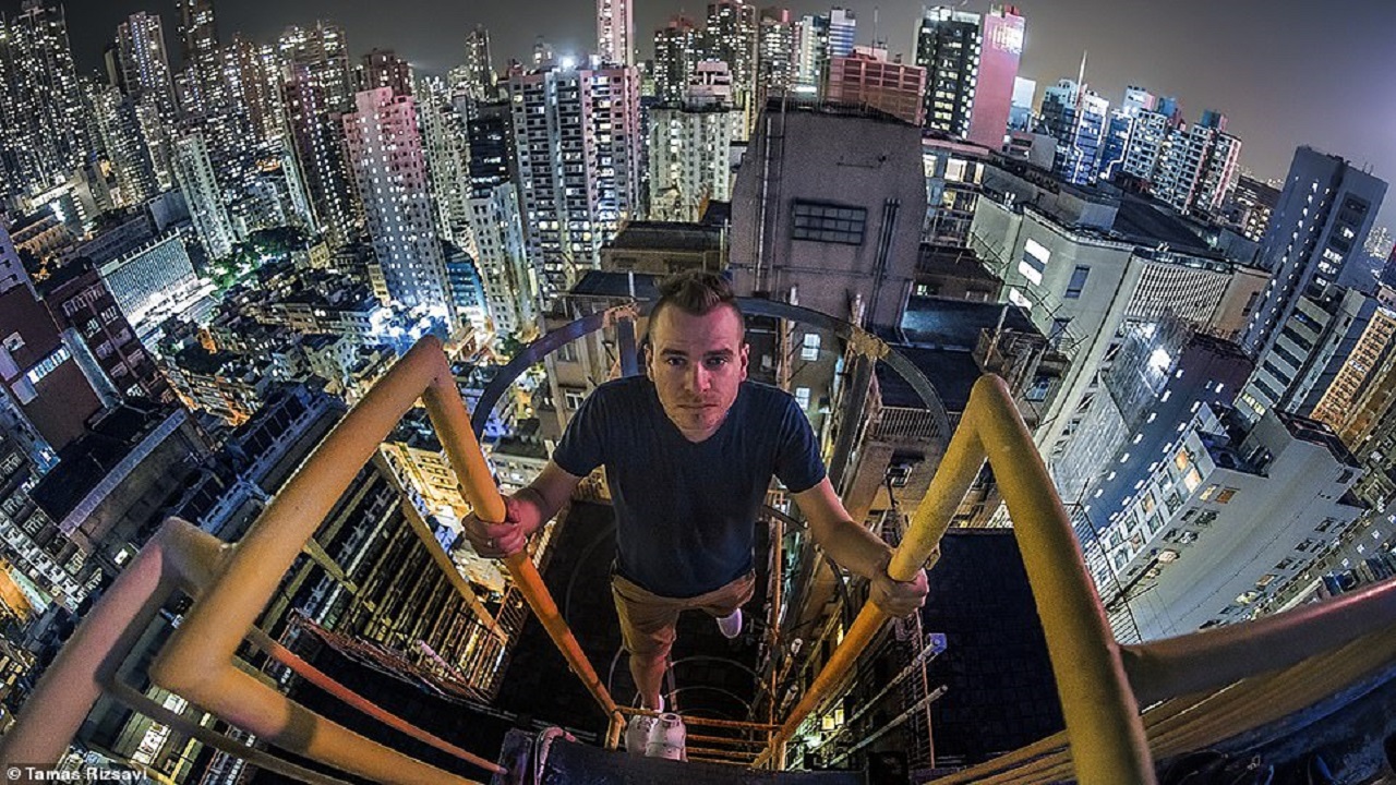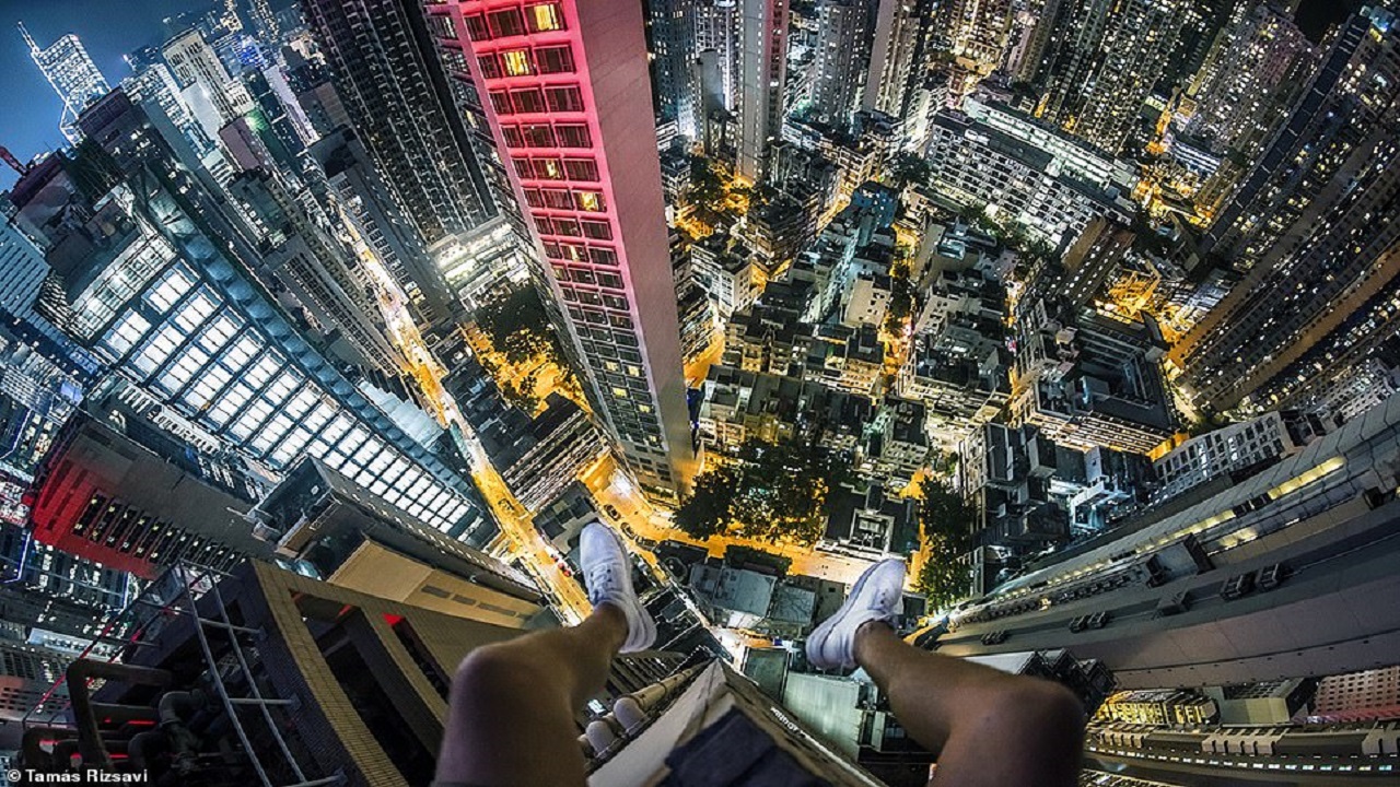 خاطر شاب هنغاري بحياته من أجل التقاط صور من أعلى طابق في مجموعة ابراج سكنية، تصل إلى 50 طابقاً، في هونغ كونغ.