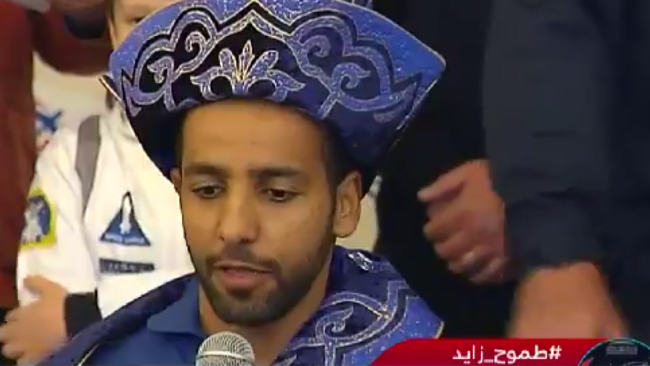 واتشح هزاع المنصوري ورواد الفضاء الآخرين، خلال المؤتمر، بلباس كازاخي تقليدي في تقليد روسي معتمد بعد المهمات الفضائية .