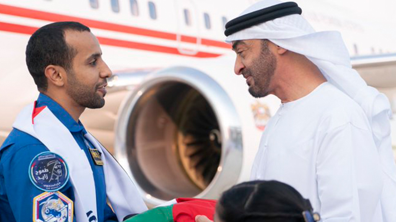نشر رائد الفضاء الإماراتي هزاع المنصوري، في حسابع على موقع التواصل الاجتماعي "تويتر"، صورة تجمعه بصاحب السمو الشيخ محمد بن زايد آل نهيان، ولي عهد أبوظبي نائب القائد الأعلى للقوات المسلحة، بعد عودته إلى أرض الوطن، بعد إنجاز مهمته التاريخية.