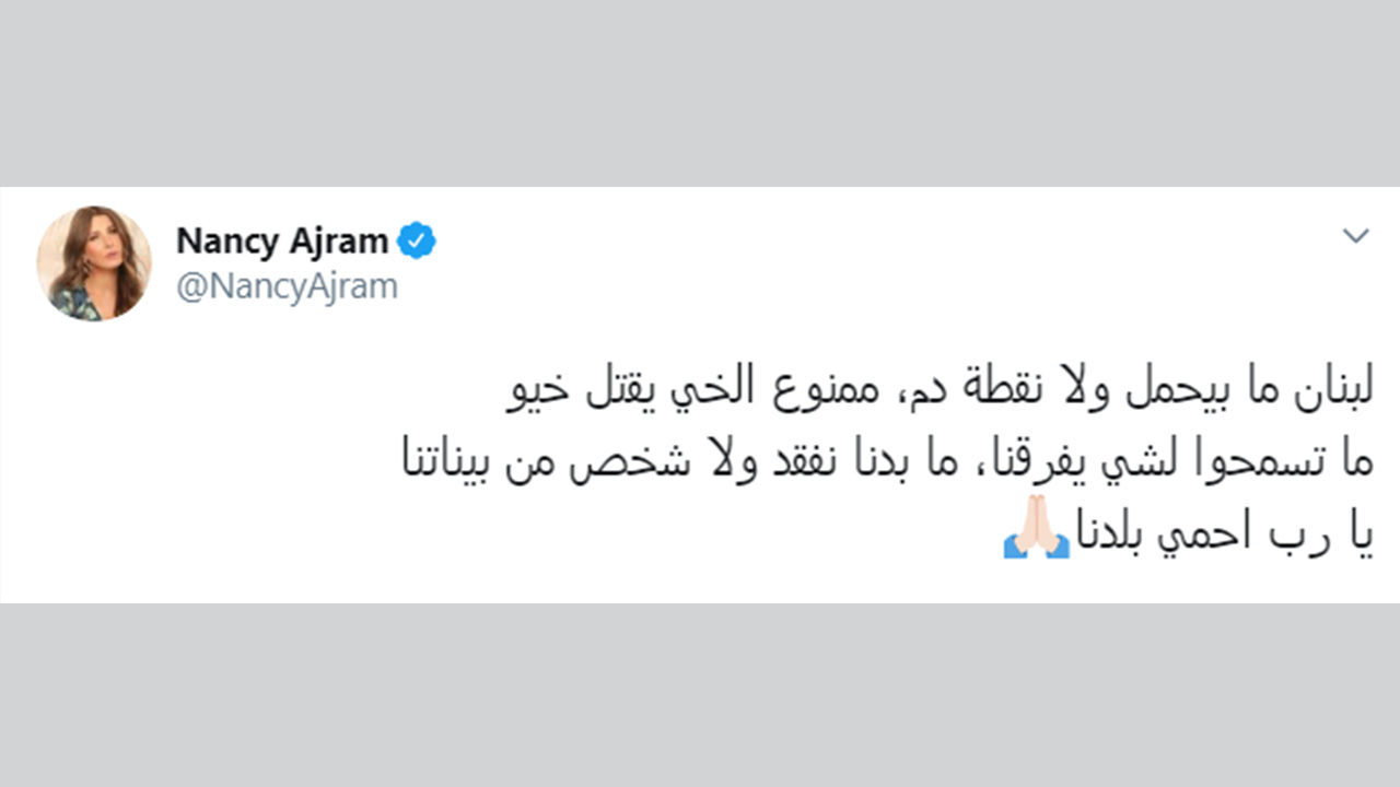 وقالت نانسي في حساباتها على مواقع التواصل الاجتماعي: "لبنان ما بيحمل ولا نقطة دم، ممنوع الخي يقتل خيو.. ما تسمحوا لشي يفرقنا، ما بدنا نفقد ولا شخص من بيناتنا.. يا رب احمي بلدنا".