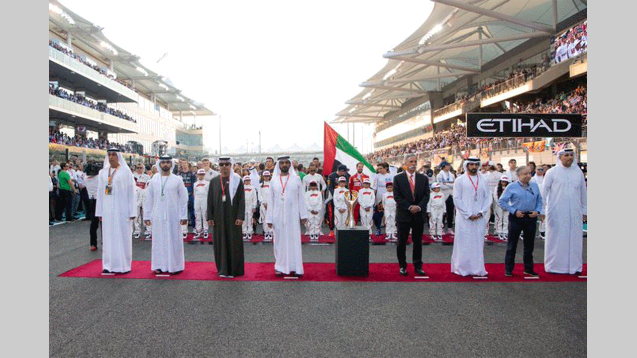 وكان صاحب السمو الشيخ محمد بن راشد آل مكتوم - يرافقه سمو الشيخ حمدان بن محمد بن راشد آل مكتوم وسمو الشيخ هزاع بن زايد آل نهيان - قد حضر إلى نقطة انطلاق سيارات سباق جائزة الاتحاد للطيران الكبرى للفورمولا 1 " أبوظبي 2019 " .. معلنا بدء انطلاق سباق الجولة الختامية لموسم 2019 بعد عزف السلام الوطني لدولة الإمارات العربية المتحدة.