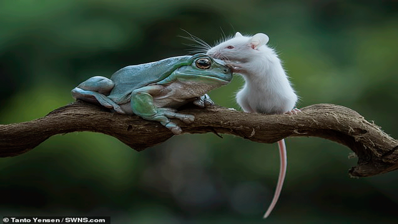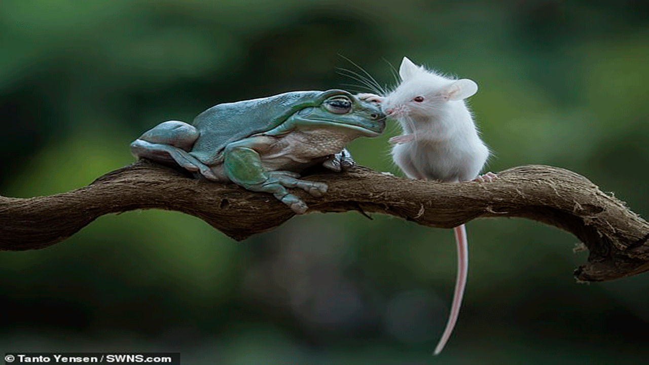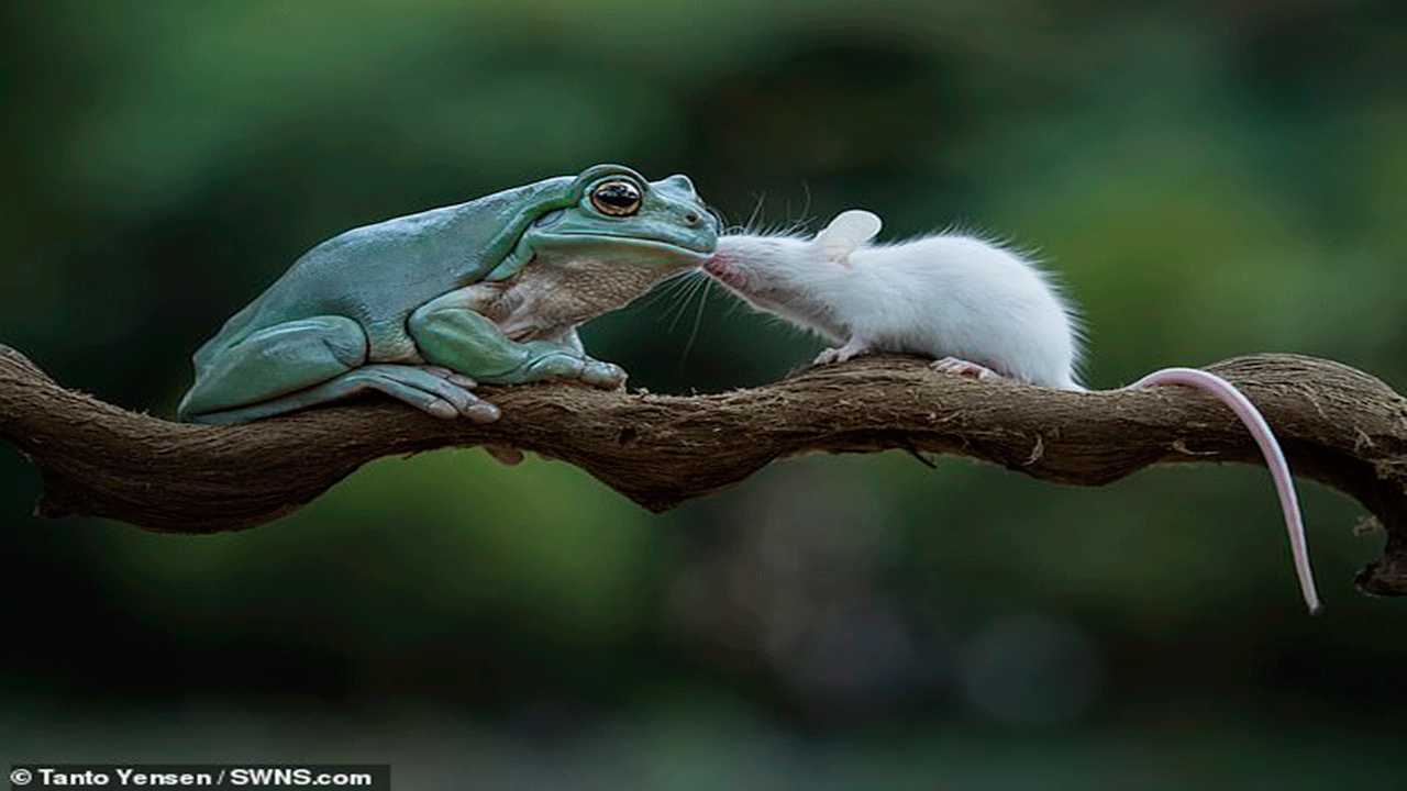 وتظهر الصور قيام الفأر بإغماض عينيه، فيما يستعد الضفدع لالتهامه، إلا أنه يغير رأيه ويقرر عدم أكل الفأر الصغير.