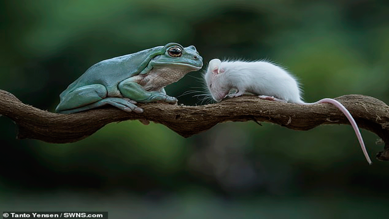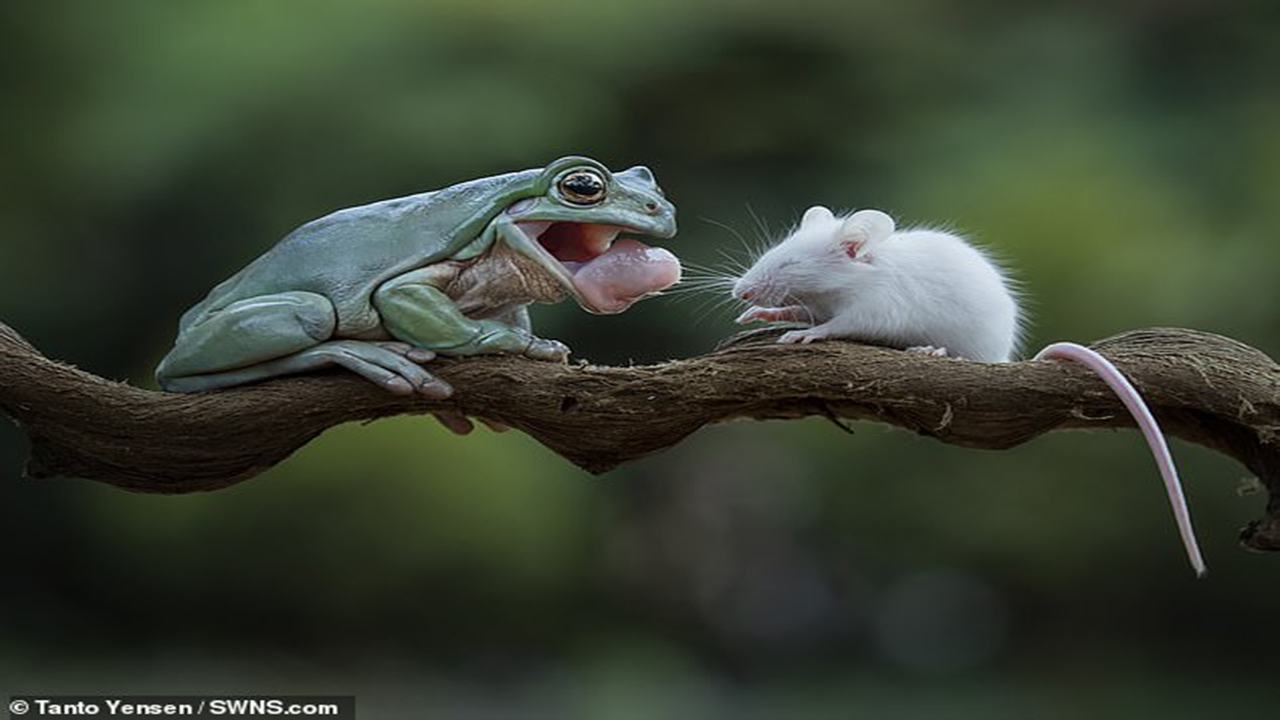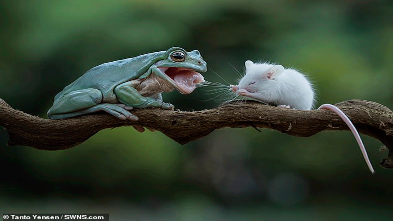 لقطات مذهلة وغير اعتيادية، التقطها المصور الفوتوغرافي تانتو ينسين في جاكرتا، أندونيسيا، تظهر ضفدعا جائعا بجانب فأر أبيض على غصن شجرة .