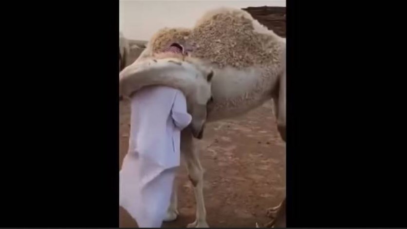 أشعل مقطع فيديو لمواطن سعودي وناقته مواقع التواصل الاجتماعي، بطريقة معانقتها لمالكها.