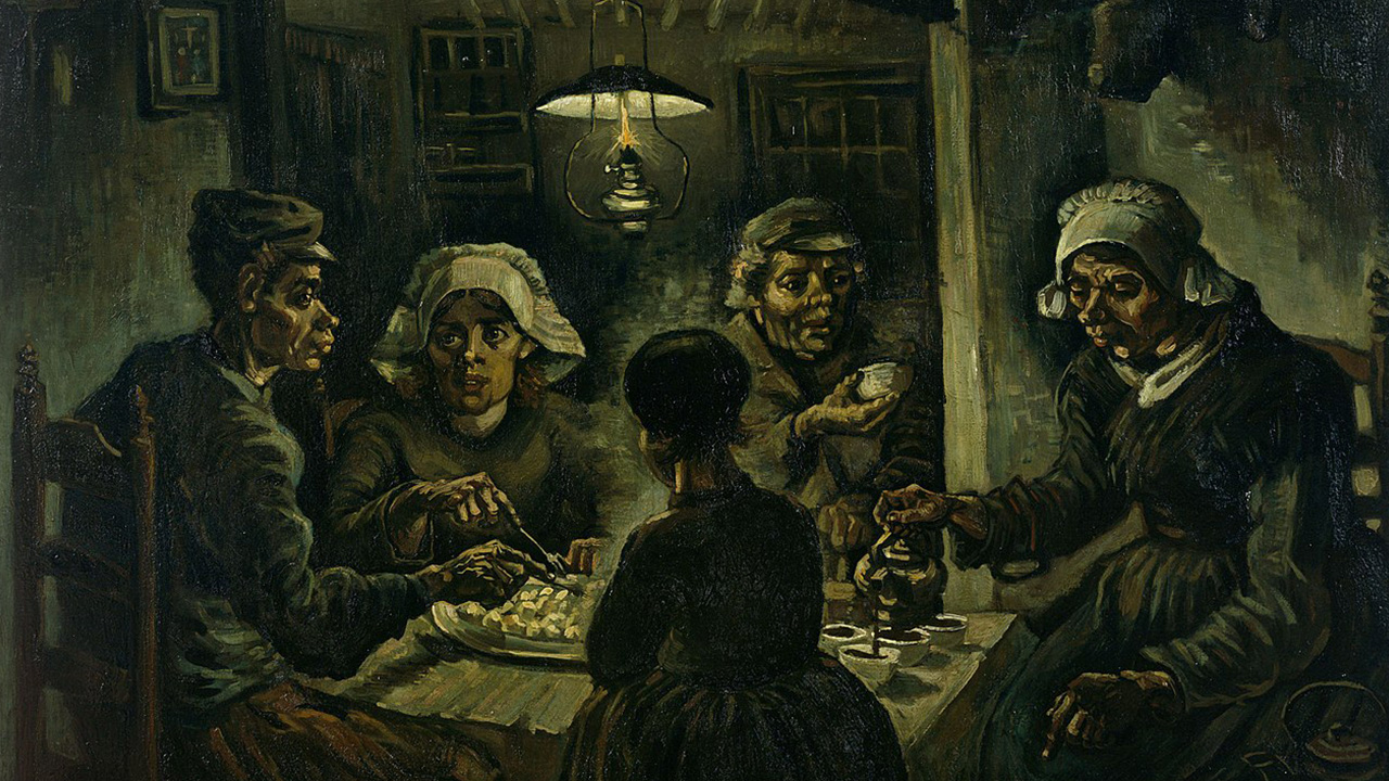 فلاحون بأيدٍ خشنة ومجعّدة، ووجوه قاسية الملامح، بارزة العظام يُضيئها نور خافت من فانوس معلق، وصحن بطاطس كبير تمتد إليه أصابع تبدو كالعظام لفرط هزلها وضعفها، وامرأة تصب القهوة، وطاولة بأطراف مهترئة ومتآكلة. كانت كل هذه تفاصيل رسمها الفنان الهولندي فينسنت فان غوخ في لوحته الشهيرة "آكلو البطاطا" التي قد لا تنجذب العين لها بسهولة لكآبة جوها وملامح شخصياتها الدميمة إلى حد ما.
