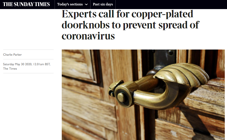اقترح عالم الأحياء الدقيقة في جامعة ساوثامبتون البريطانية، ويليام كيفيل، أن يتم طلاء مقابض الأبواب وعربات التسوق والدرابزين في وسائل النقل العام، وحتى معدات الصالات الرياضية بالنحاس، لمنع انتشار فيروس كورونا المستجد (كوفيد-19).