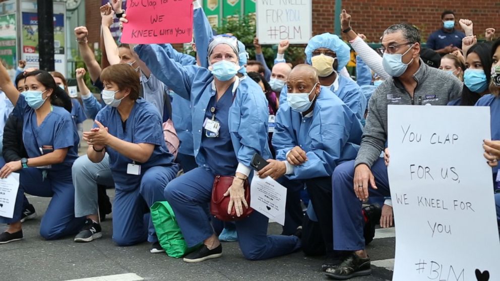 تضامن العديد من الممرضات والعاملين في المجال الصحي مع المتظاهرين ضد العنصرية في ولاية نيويورك، وشاركوا بالاحتجاجات وهتفوا ضد العنصرية بعد أن جثوا على ركبهم تضامنا مع جورج فلويد الذي قتل على يد أحد الضباط في الشرطة الأميركية.