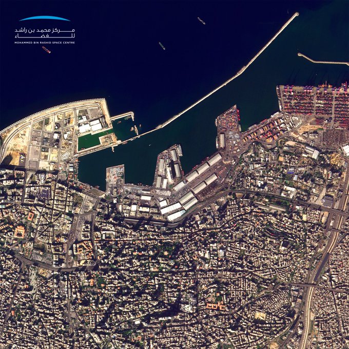 نشر الحساب الرسمي لمركز محمد بن راشد للفضاء صورتين لمرفأ العاصمة اللبنانية بيروت قبل وبعد الانفجار الأخير الذي وقع في مرفئها.