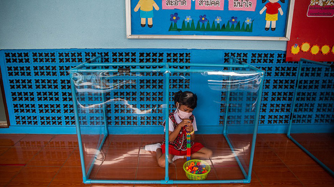 افتتحت رياض أطفال في تايلاند أبوابها، أخيراً، لطلابها الصغار، ويُعتقد أنها واحدة من أكثر المدارس صرامة في الاحترازات الصحية ضد فيروس "كورونا" المستجد، حيث ألزمت المدرسة طلابها باللعب بمفردهم خلال أوقات الدوام تحسباً من إصابتهم بالفيروس.